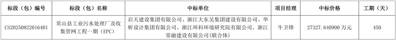 原标题:2.73亿!衢州市常山县工业污水处理厂及收集管网工程(EPC)中标结果公示