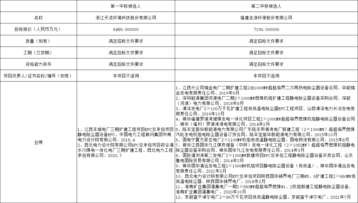 第二中标候选人:福建龙净环保股份有限公司,投标报价:7190万。