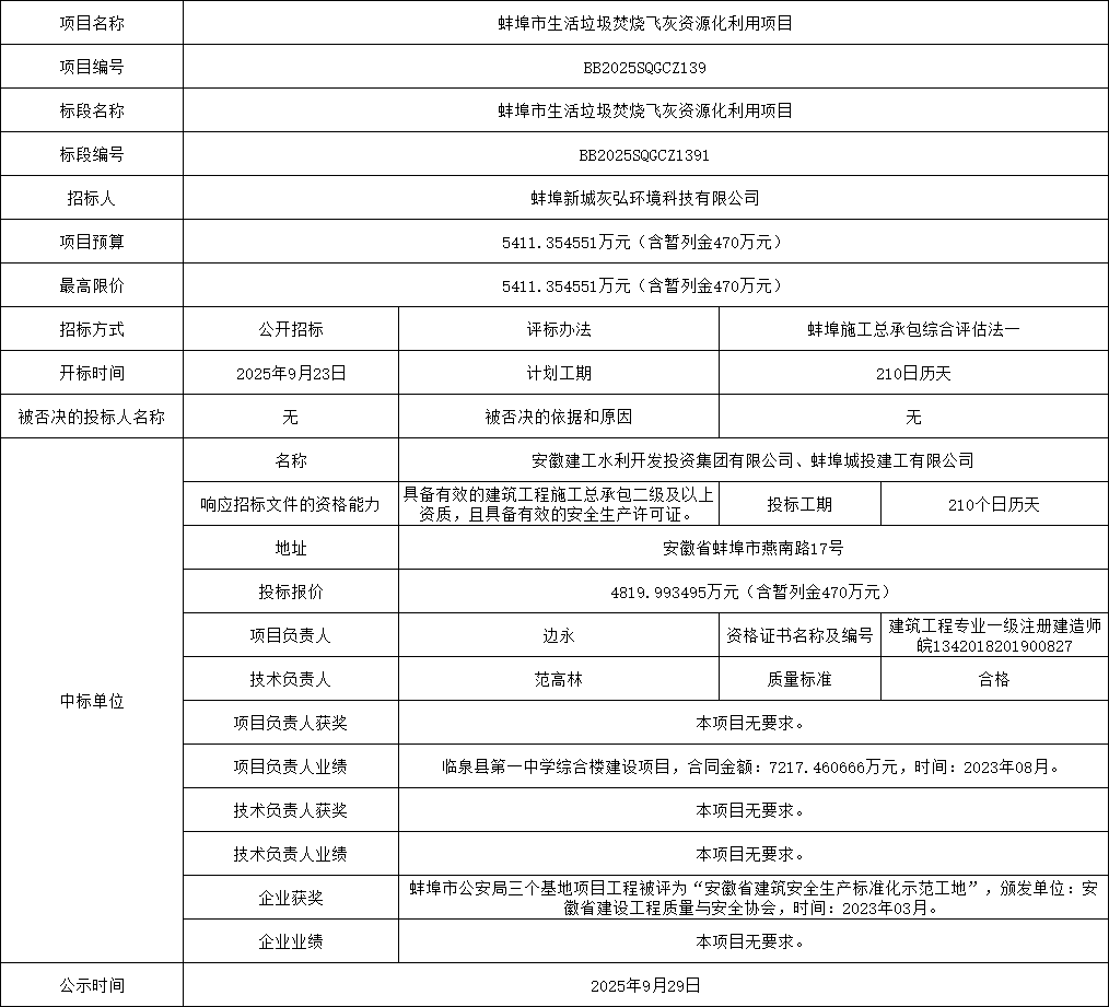 蚌埠市生活垃圾焚烧飞灰资源化利用项目中标