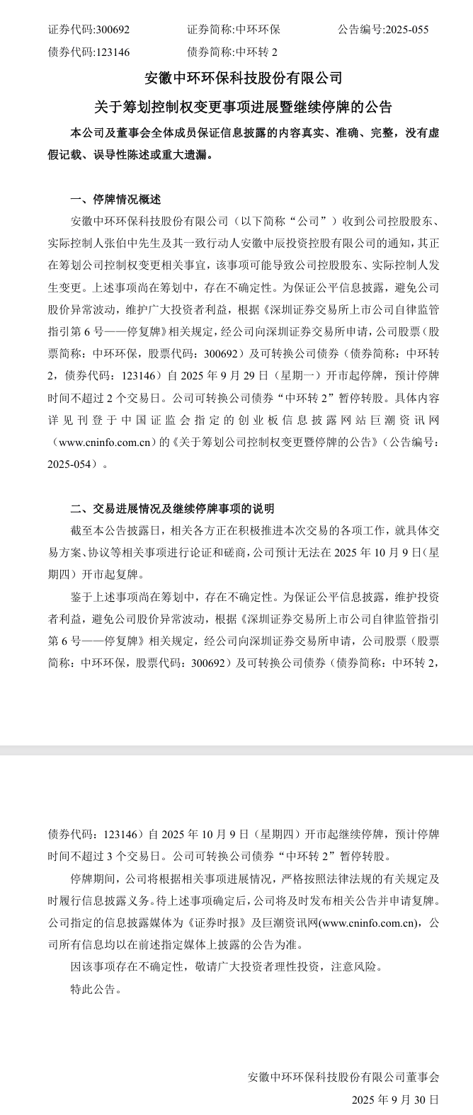 安徽中环环保科技股份有限公司(简称:中环环保)公告称,公司预计无法在2025年10月9日(星期四)开市起复牌。鉴于控制权变更事项尚在筹划中,存在不确定性。为保证公平信息披露,维护投资者利益,避免公司股价异常波动,公司股票及可转换公司债券自2025年10月9日(星期四)开市起继续停牌,预计停牌时间不超过3个交易日。公司可转换公司债券“中环转2”暂停转股。