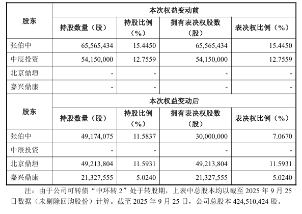 按停牌前收盘价测算,本次交易价格折价率约4%。为稳控制权,张伯中股权交割后将放弃1917.41万股股份表决权,届时其表决权比例降至7.07%。权益变动完成后,中环环保控股股东将变为北京鼎垣,实控人变为刘杨,股票10月10日开市起复牌。