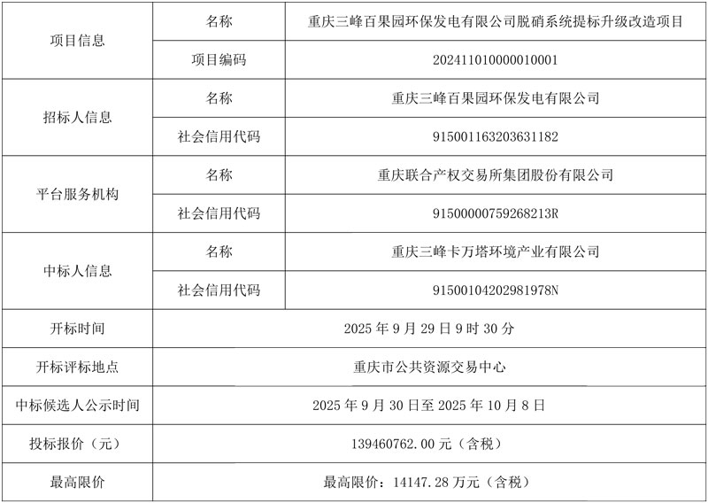 1.39亿!三峰卡万塔中标重庆三峰百果园环保发电有限公司脱硝系统提标升级改造项目