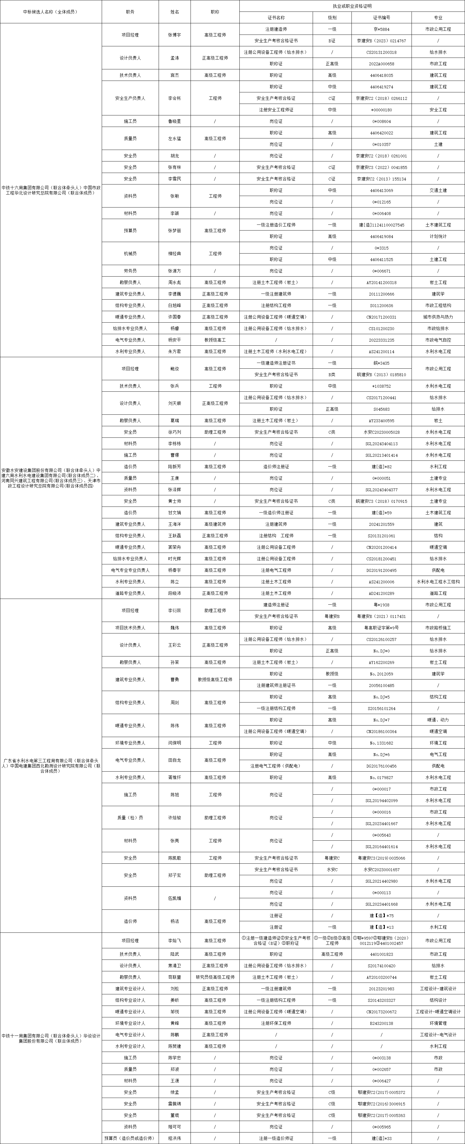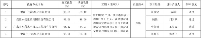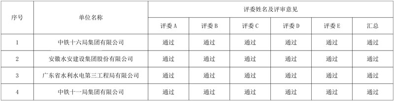 中标候选人名称:安徽水安建设集团股份有限公司(联合体牵头人),中建六局水利水电建设集团有限公司(联合体成员二)、河南同兴建筑工程有限公司(联合体成员三)、天津市政工程设计研究总院有限公司(联合体成员四)