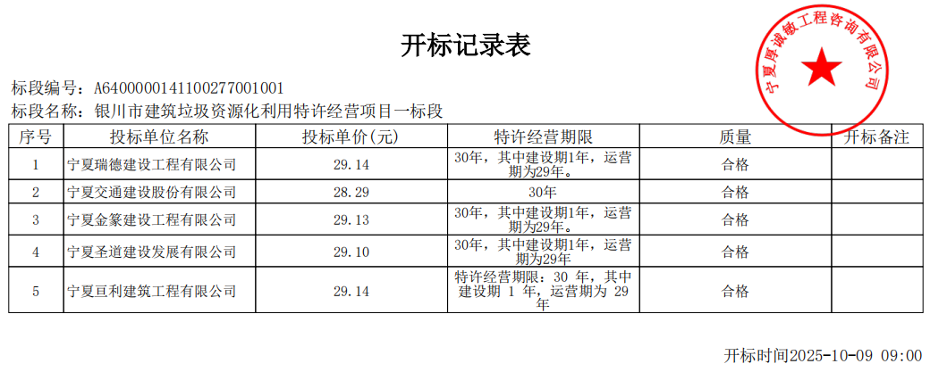 宁夏厚诚敏工程咨询有限公司受银川市城市管理局的委托,对银川市建筑垃圾资源化利用特许经营项目一标段进行公开招标,已于2025-10-09 13:59:00完成评标工作,经评标委员会对所有投标人的投标文件详细评审,推荐出中标结果候选人。