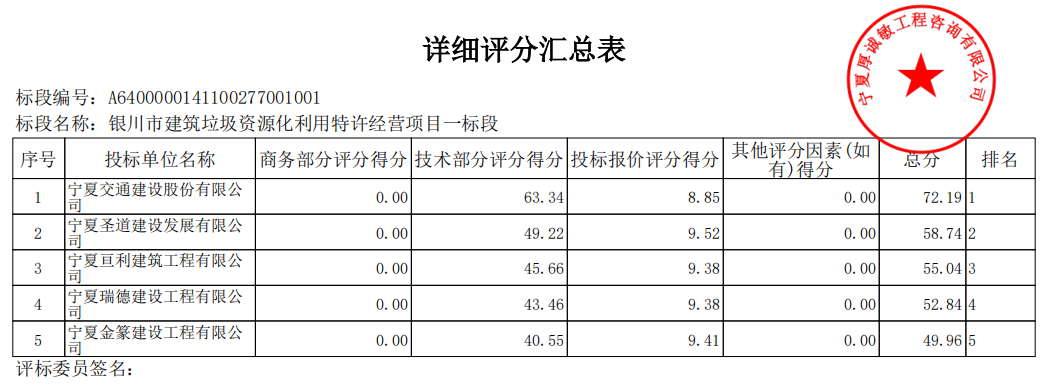 银川市建筑垃圾资源化利用特许经营项目中标候选人公示