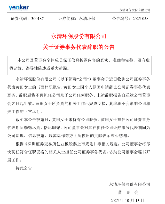 永清环保股份有限公司(简称:永清环保)公告称,公司董事会于近日收到公司证券事务代表黄田女士的书面辞职报告,黄田女士因个人原因申请辞去公司证券事务代表职务,辞职后将不再担任公司及子公司任何职务。目前,黄田女士所负责的相关工作已完成交接,其辞职不会影响公司相关工作的正常运行。