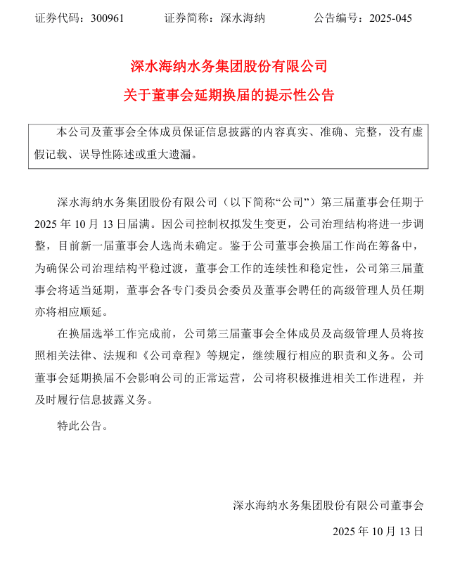 深水海纳水务集团股份有限公司(简称:深水海纳)近日公告称,因公司控制权拟发生变更,公司治理结构将进一步调整,目前新一届董事会人选尚未确定。鉴于公司董事会换届工作尚在筹备中,为确保公司治理结构平稳过渡,董事会工作的连续性和稳定性,公司第三届董事会将适当延期,董事会各专门委员会委员及董事会聘任的高级管理人员任期亦将相应顺延