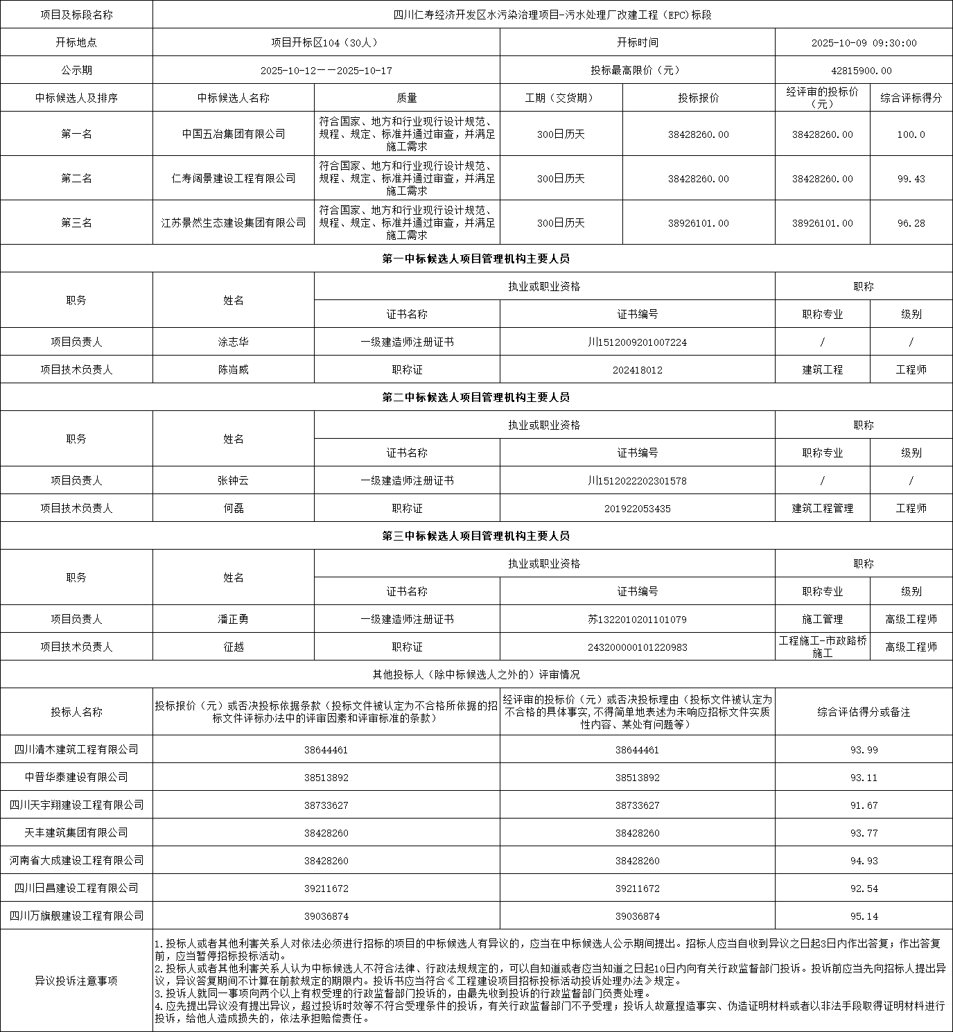 四川仁寿经济开发区水污染治理项目-污水处理厂改建工程(EPC)-标段中标候选人公示
