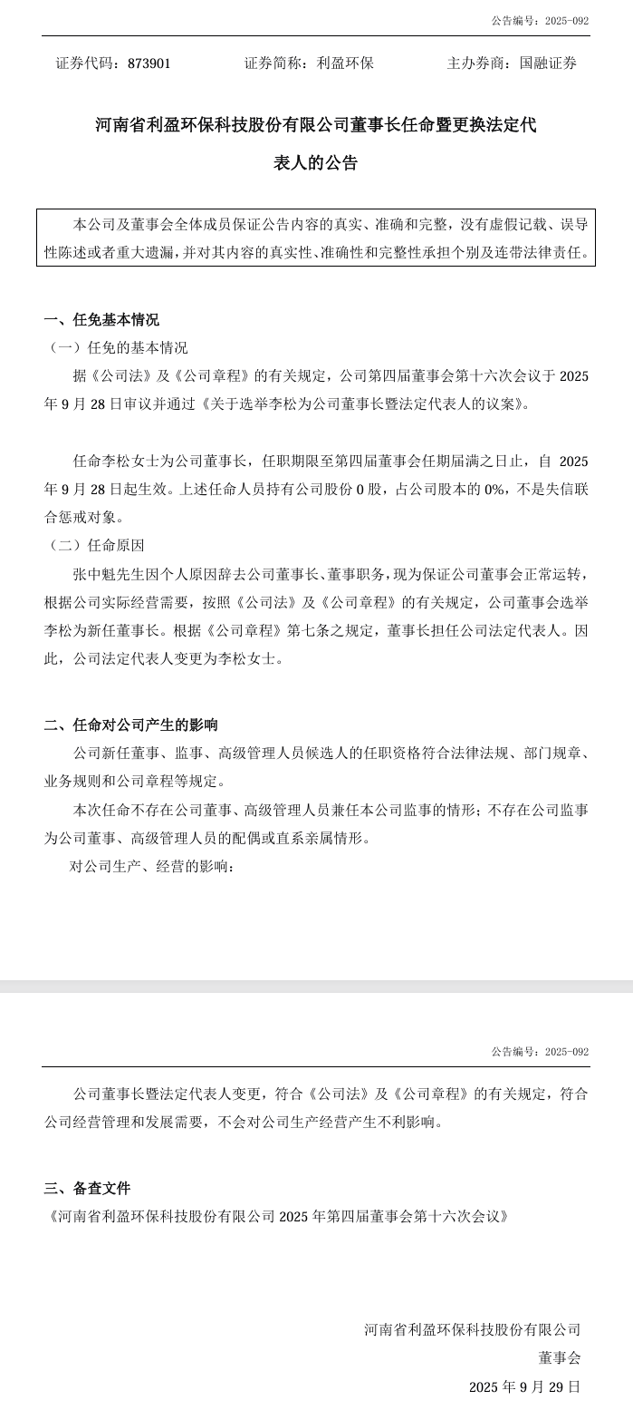 新三板上市公司河南省利盈环保科技股份有限公司(简称:利盈环保)公告称,公司第四届董事会第十六次会议于 2025年 9 月 28 日审议并通过《关于选举李松为公司董事长暨法定代表人的议案》。任命李松女士为公司董事长,任职期限至第四届董事会任期届满之日止,自 2025年 9 月 28 日起生效。上述任命人员持有公司股份 0 股,占公司股本的 0%,不是失信联合惩戒对象。
