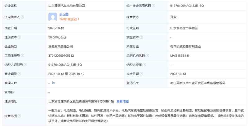 10月13日,山东理想汽车电池有限公司(下称“理想电池”)正式成立,法定代表人刘立国,注册资本3亿元人民币,所属行业为汽车制造业,经营范围包含电池制造;电池销售;新兴能源技术研发;电动汽车充电基础设施运营;输配电及控制设备制造;智能输配电及控制设备销售;集中式快速充电站;新材料技术研发等。