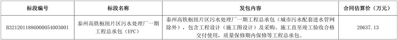 原标题:2.06亿!江苏泰州高铁枢纽片区污水处理厂一期工程总承包(EPC)招标