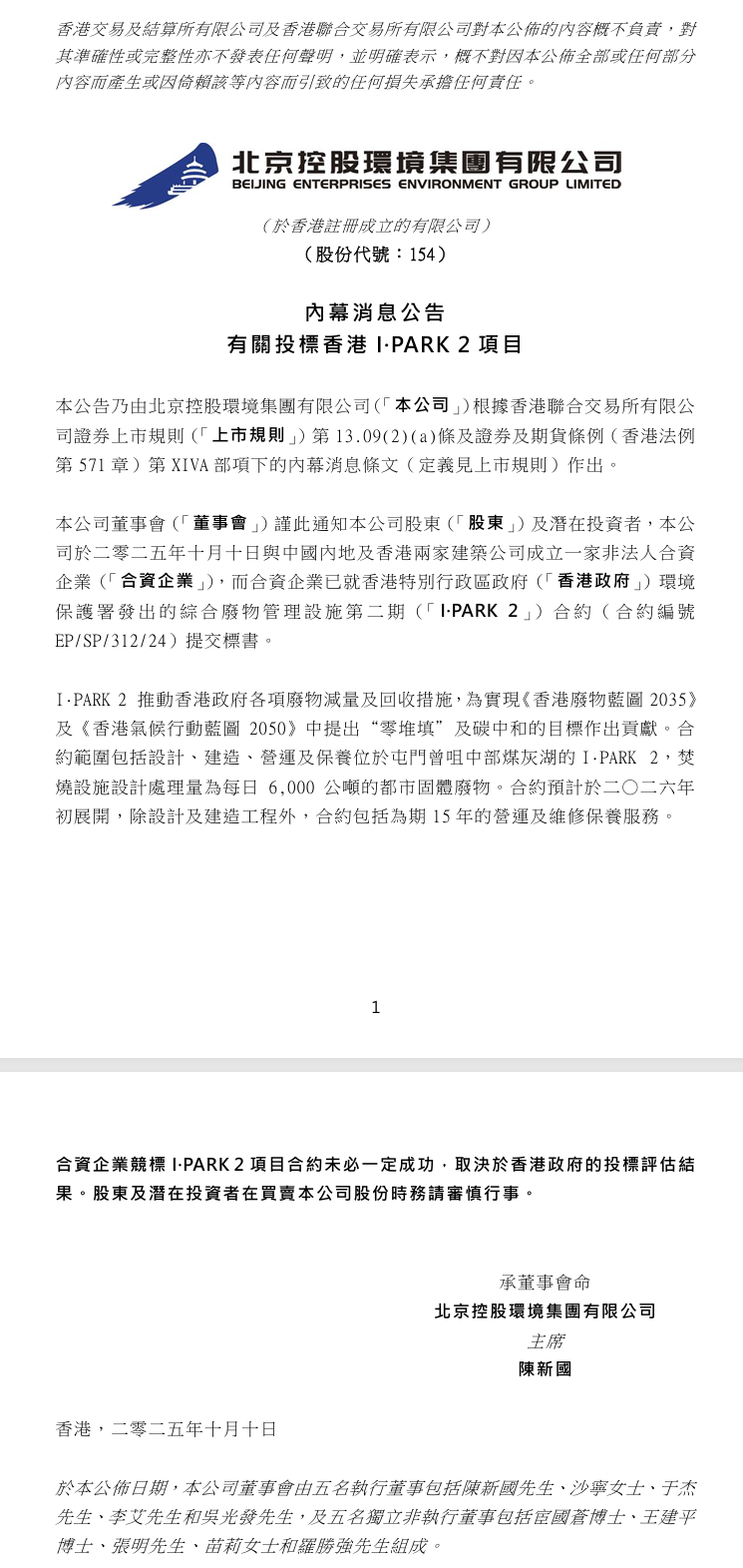 港股上市环境企业北京控股环境集团公告称,公司于2025年10月10日与中国内地及香港两家建筑公司成立一家非法人合资企业,而合资企业已就香港特别行政区政府环境保护署发出的综合废物管理设施第二期合约(合约编号EP/SP/312/24)提交标书。