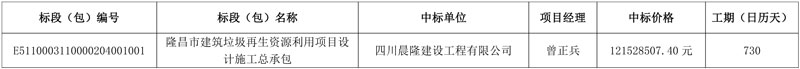隆昌市建筑垃圾再生资源利用项目设计施工总承包中标结果公告