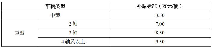 对提前淘汰的国三、国四非营运中重型货车,予以淘汰补贴;对提前淘汰国三、国四非营运中重型货车并新购新能源货车的,予以淘汰更新补贴,补贴金额为淘汰补贴与更新补贴之和。淘汰补贴标准详见表1,更新补贴标准详见表2。