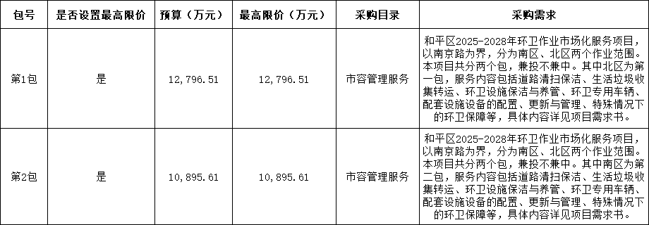 天津和平区2025-2028年环卫作业市场化服务项目最高限价:23692.12万元。
