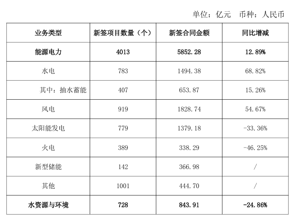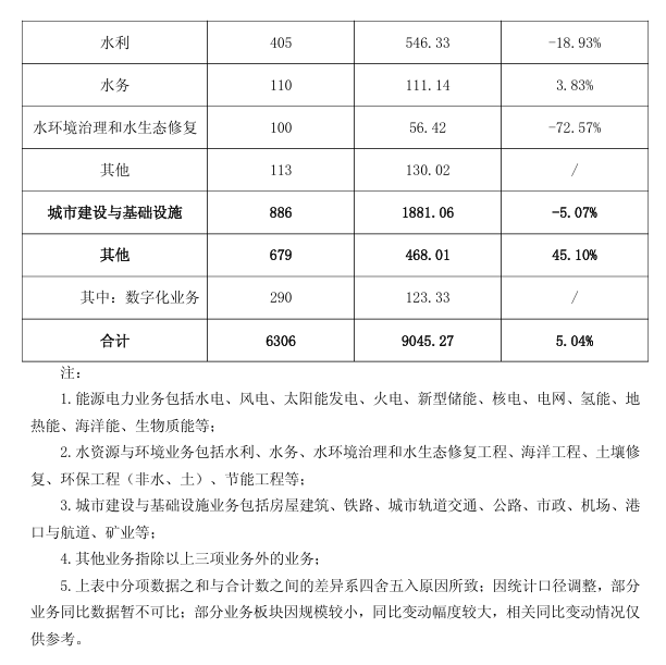 中国电力建设股份有限公司(简称:中国电建)近日发布《2025年1月至9月主要经营情况公告》。2025年1月至9月,中国电建新签能源电力项目4013个,合同金额5852.28亿元,同比增加12.89%;新签水资源与环境项目728个,合同金额843.91亿元,同比减少24.86%;新签城市建设与基础设施项目886个,合同金额1881.06亿元,同比减少5.07%;其他项目679个,合同金额468.01亿元,同比增加45.10%。