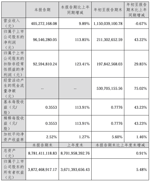 圣元环保股份有限公司(简称:圣元环保)近日发布《2025年三季度报告》。2025年前三季度,圣元环保实现营业收入为11.5亿元,同比减少0.67%;归属于上市公司股东的净利润为2.11亿元,同比增长43.22%;归属于上市公司股东的扣除非经常性损益的净利润为1.98亿元,同比增长29.85%;基本每股收益为0.7776元。