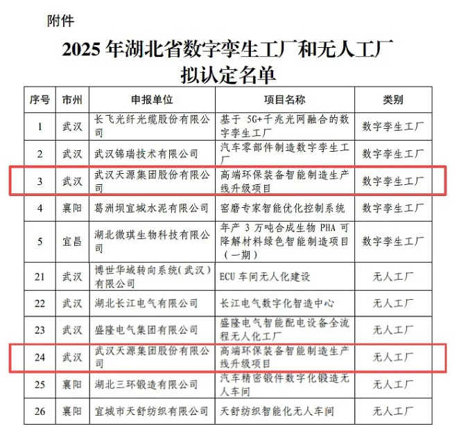 祝贺!武汉天源集团入选湖北省数字孪生工厂及无人工厂名单