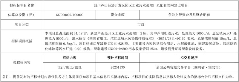 1.37亿!四川芦山经济开发区园区工业污水处理厂及配套管网建设项目将招标