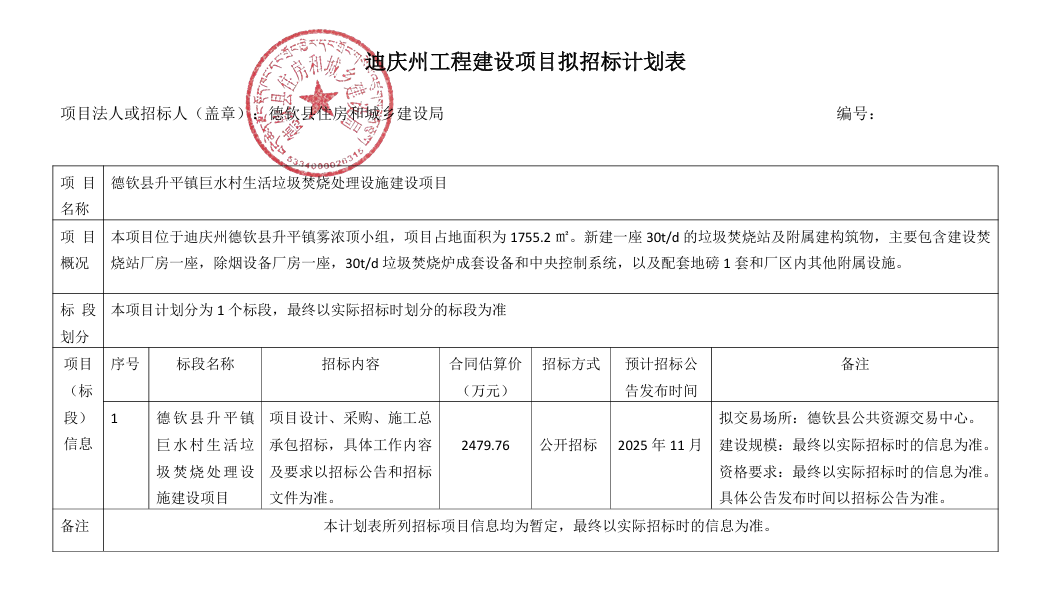 云南德钦县30t/d生活垃圾焚烧项目将招标