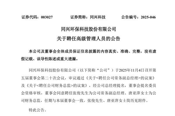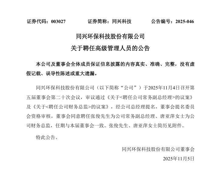 同兴环保科技股份有限公司(简称:同兴科技)公告称,公司于2025年11月4日召开第五届董事会第二十次会议,审议通过《关于<聘任公司常务副总经理>的议案》及《关于<聘任公司财务总监>的议案》,经公司总经理提名,董事会提名委员会资格审核,董事会同意聘任张俊先生为公司常务副总经理、唐亚萍女士为公司财务总监,任期与本届董事会一致。
