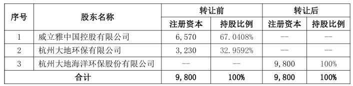杭州大地海洋环保股份有限公司(简称:大地海洋)近日公告称,公司拟以自有资金或自筹资金人民币4,000万元收购威立雅中国控股有限公司(下称“威立雅中国”)持有的威立雅资源再生(杭州)有限公司(下称“威立雅杭州”)67.0408%的股权,同时拟以自有资金或自筹资金人民币1,966.52万元收购杭州大地环保有限公司(下称“大地环保”)持有的威立雅杭州32.9592%的股权。本次交易完成后威立雅杭州成为大地海洋全资子公司。
