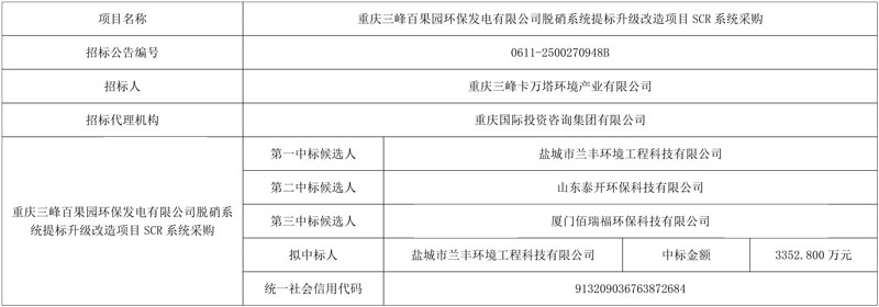 重庆三峰百果园脱硝系统提标升级改造项目SCR系统采购中标候选人公示
