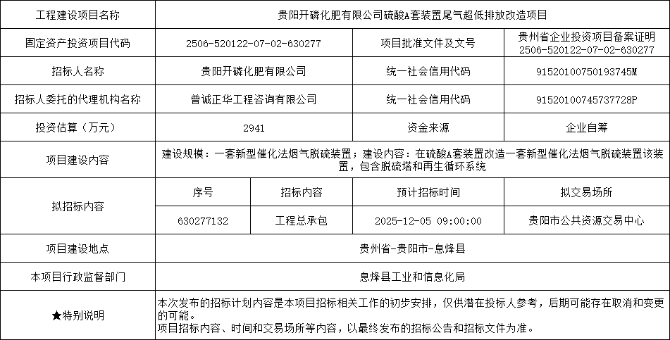 2941万!贵州开磷化肥硫酸A套装置尾气超低排放改造项目招标计划发布