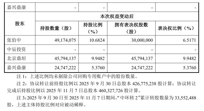 根据此前签署的《股权转让协议》《<股份转让协议>之补充协议》,张伯中先生将其持有的中环环保16,391,359股公司股票(占公司总股本的3.8407%1)转让给嘉兴鼎康,中辰投资将其持有的8,355,863股公司股票(占公司总股本的1.9579%)转让给嘉兴鼎康,中辰投资将其持有的45,794,137股公司股票(占公司总股本的10.7303%)转让给北京鼎垣,转让股份合计为70,541,359股(占公司总股本的16.5289%),股份转让单价约为8.48元/股,转让对价合计为598,215,916 元。