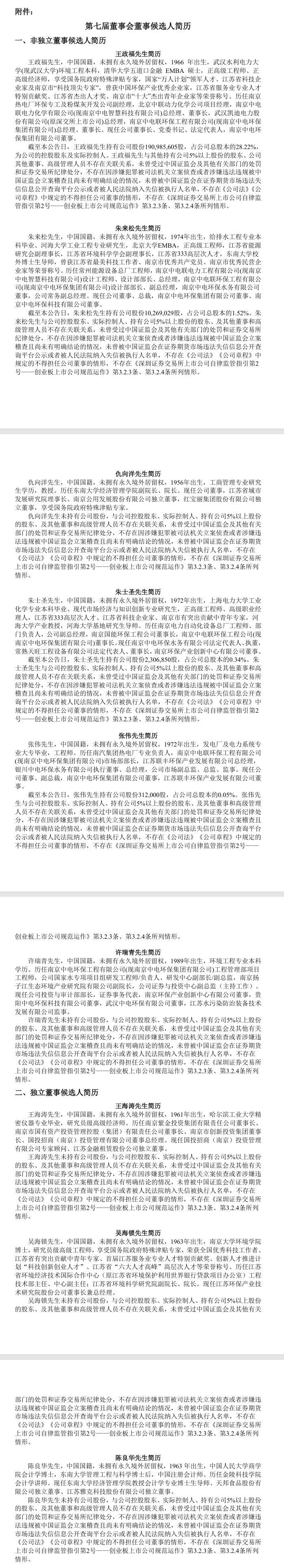 根据《公司章程》的规定,中电环保第七届董事会由8名董事组成,其中,非独立董事5名,独立董事3名。董事会同意提名王政福先生、朱来松先生、仇向洋先生、朱士圣先生、张伟先生、许瑞青先生为公司第七届董事会非独立董事候选人;提名王海涛先生、吴海锁先生、陈良华先生为公司第七届董事会独立董事候选人。