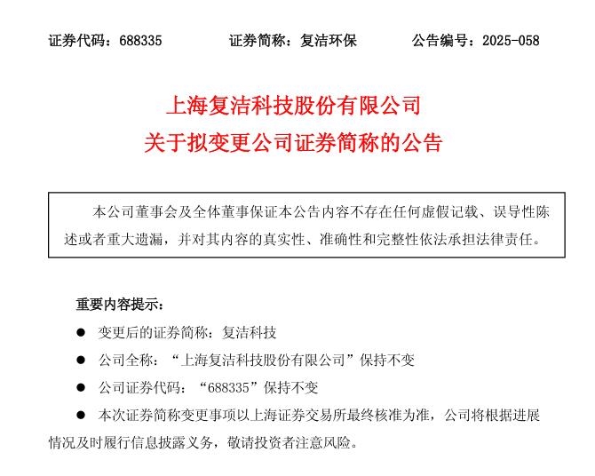 上海复洁科技股份有限公司(简称:复洁环保)公告称,公司拟变更证券简称为“复洁科技”,全称“上海复洁科技股份有限公司”保持不变,证券代码“688335”保持不变。