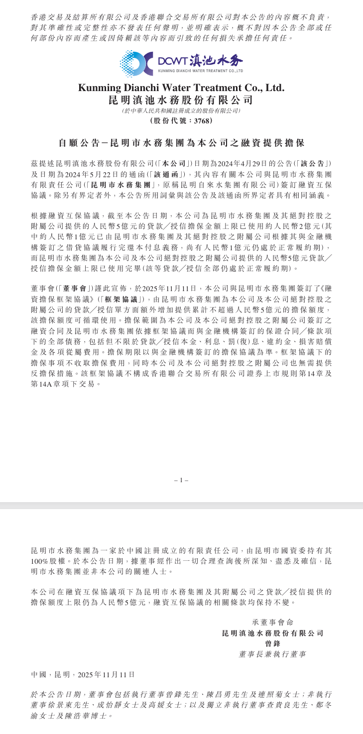 滇池水务与昆明市水务集团签订《融资担保框架协议》