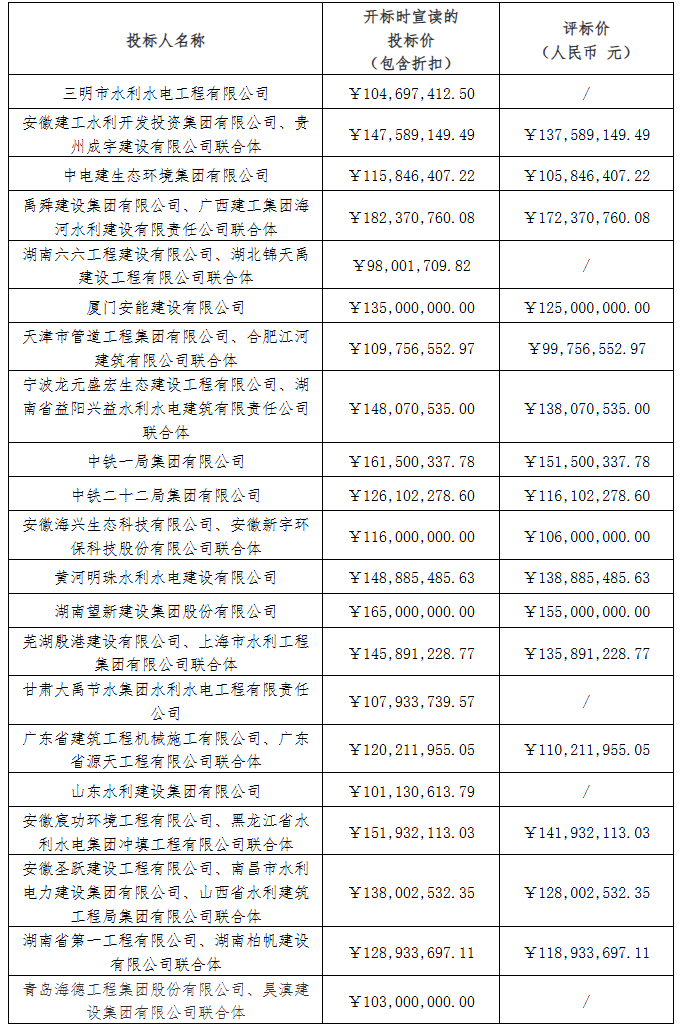 公示信息显示,该项目共有21个联合体参与投标,其中包含中电建生态环境集团有限公司、中铁一局、山东水利建设集团有限公司、湖南省第一工程有限公司等央国企。