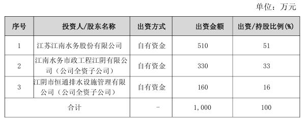 其中,江南水务出资510万元,占注册资本的51%,市政工程公司出资330万元,占注册资本的33%,恒通排水公司出资160万元,占注册资本的16%。资金来源为公司及子公司的自有资金。