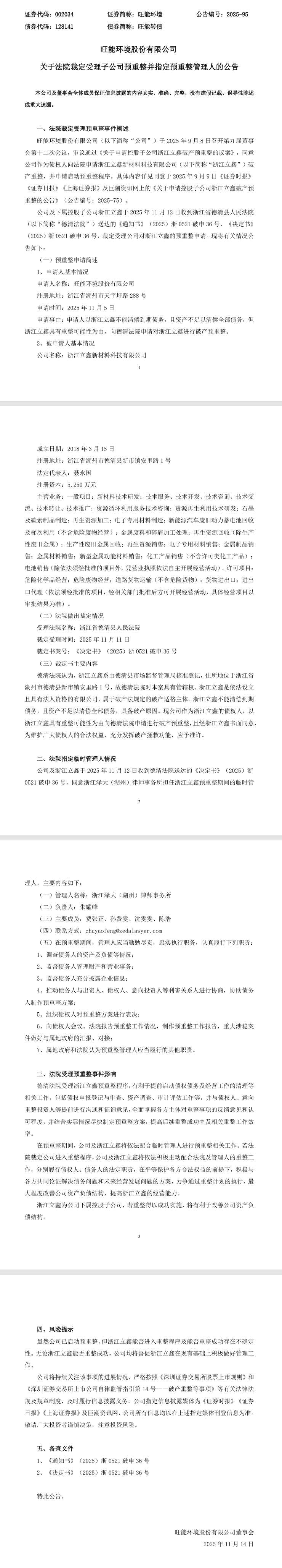 旺能环境股份有限公司(简称:旺能环境)公告称,11月12日,公司收到了德清法院送达的《决定书》(2025)浙0521 破申36号,同意浙江泽大(湖州)律师事务所担任浙江立鑫新材料科技有限公司(下称“浙江立鑫”)预重整期间的临时管理人。