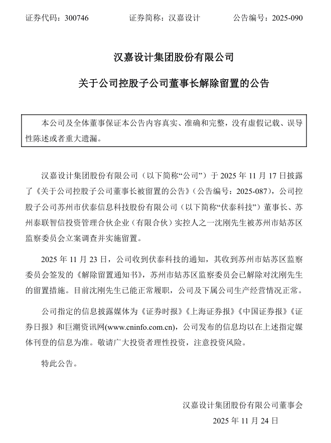 汉嘉设计集团股份有限公司(简称:汉嘉设计)11月24日早间公告称,公司收到司控股子公司苏州市伏泰信息科技股份有限公司(下称“伏泰科技”)的通知,其收到苏州市姑苏区监察委员会签发的《解除留置通知书》,苏州市姑苏区监察委员会已解除对沈刚先生的留置措施。目前沈刚先生已能正常履职,公司及下属公司生产经营情况正常。