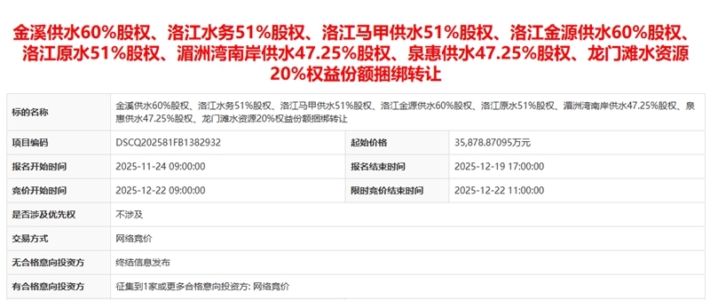 近日,据福建省产权交易中心网站,金溪供水60%股权、洛江水务51%股权、洛江马甲供水51%股权、洛江金源供水60%股权、洛江原水51%股权、湄洲湾南岸供水47.25%股权、泉惠供水47.25%股权、龙门滩水资源20%权益份额捆绑转让,挂牌价35,878.87095万元,报名截止时间为2025年12月19日17:00:00。意向受让方须同时报名受让上述八个标的,如竞价溢价成交,溢价部分按照八个标的挂牌价格各自占总挂牌价格比例分配。