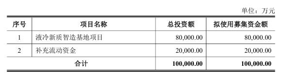 广东申菱环境系统股份有限公司(简称:申菱环境)近日发布《向不特定对象发行可转换公司债券预案》,发行数量不超过10,000,000张(含本数),每张面值为人民币100元,募集资金总额不超过100,000万元(含本数),扣除发行费用后的募集资金净额将用于投入液冷新质智造基地项目、补充流动资金。其中,液冷新质智造基地项目总投资额80,000万元,拟使用募集资金额80,000万元;补充流动资金拟使用募集资金额20,000万元。