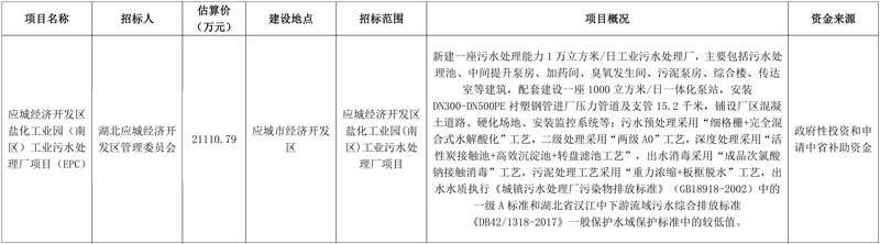湖北省应城经济开发区盐化工业园(南区)工业污水处理厂项目(EPC)招标计划发布。