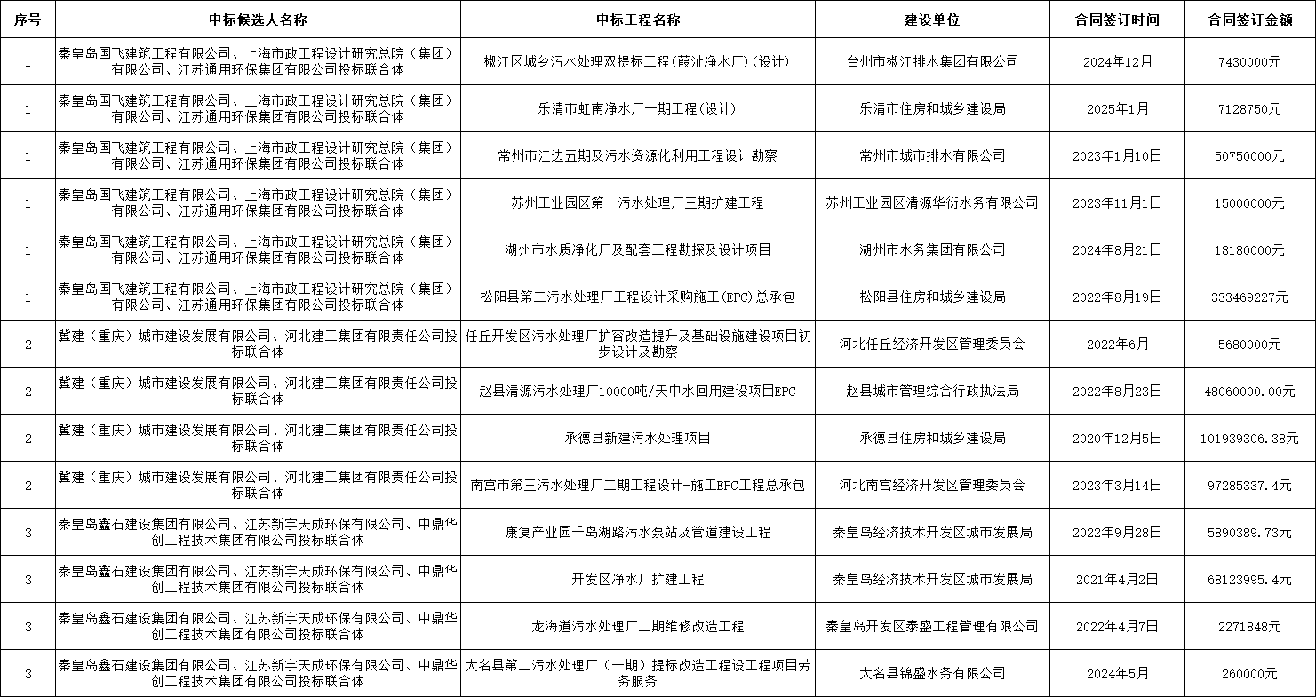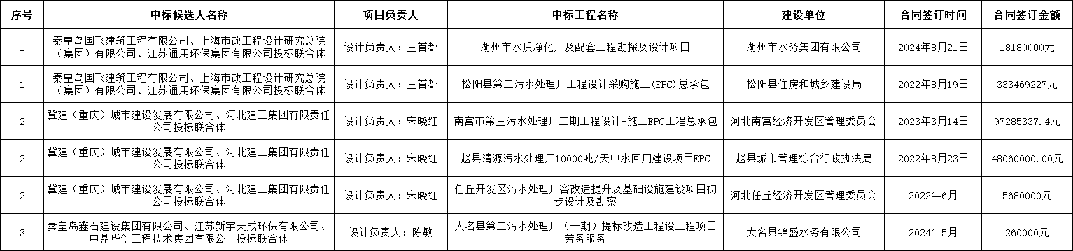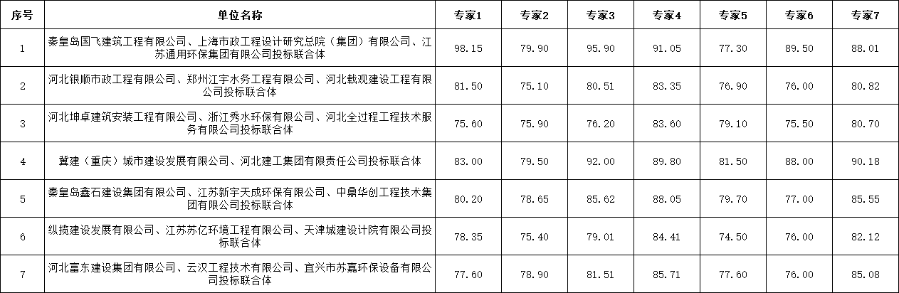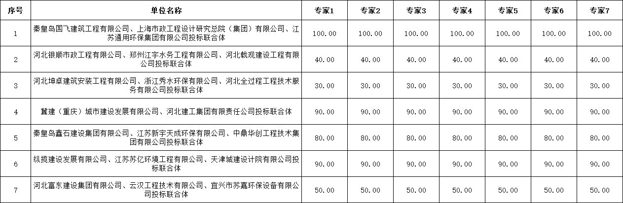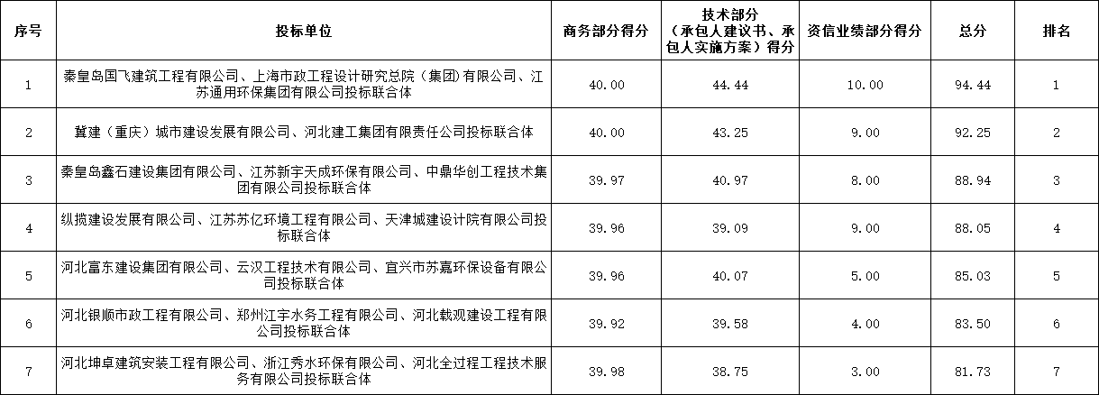 8.其他公示内容:全部投标单位:冀建(重庆)城市建设发展有限公司、河北建工集团有限责任公司投标联合体,秦皇岛国飞建筑工程有限公司、上海市政工程设计研究总院(集团)有限公司、江苏通用环保集团有限公司投标联合体,河北富东建设集团有限公司、云汉工程技术有限公司、宜兴市苏嘉环保设备有限公司投标联合体,秦皇岛鑫石建设集团有限公司、江苏新宇天成环保有限公司、中鼎华创工程技术集团有限公司投标联合体,纵揽建设发展有限公司、江苏苏亿环境工程有限公司、天津城建设计院有限公司投标联合体,河北银顺市政工程有限公司、郑州江宇水务工程有限公司、河北载观建设工程有限公司投标联合体,河北坤卓建筑安装工程有限公司、浙江秀水环保有限公司、河北全过程工程技术服务有限公司投标联合体,龙嘉建设集团有限公司、华昕设计集团有限公司、江苏德环环保集团有限公司投标联合体。