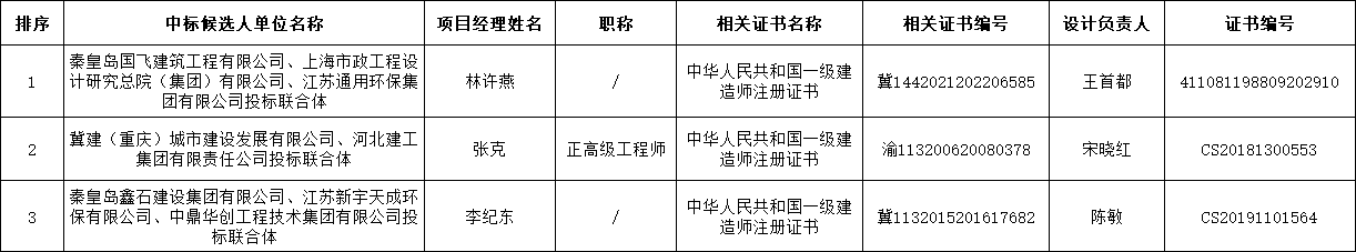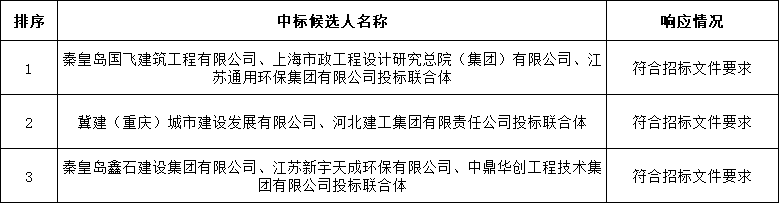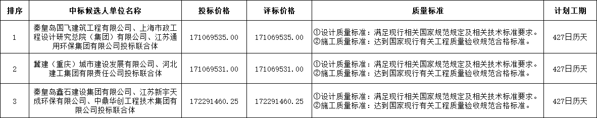 第一中标候选人:秦皇岛国飞建筑工程有限公司、上海市政工程设计研究总院(集团)有限公司、江苏通用环保集团有限公司联合体,投标价格:171069535.00元;