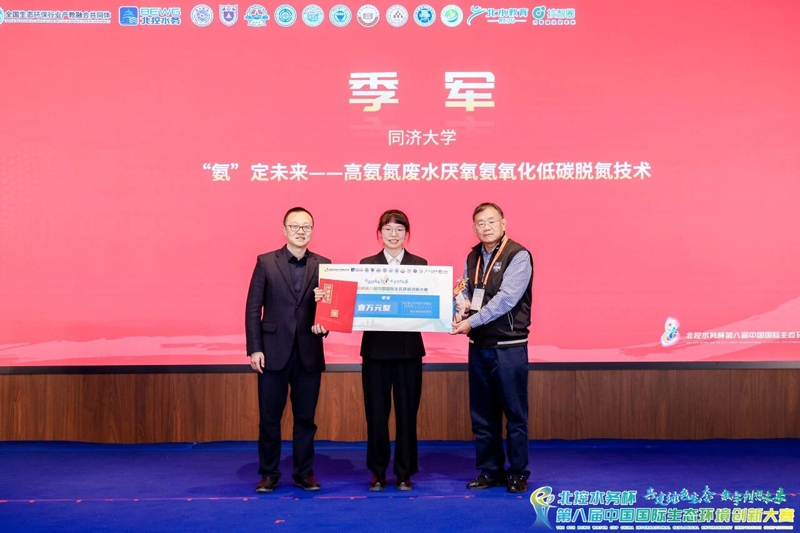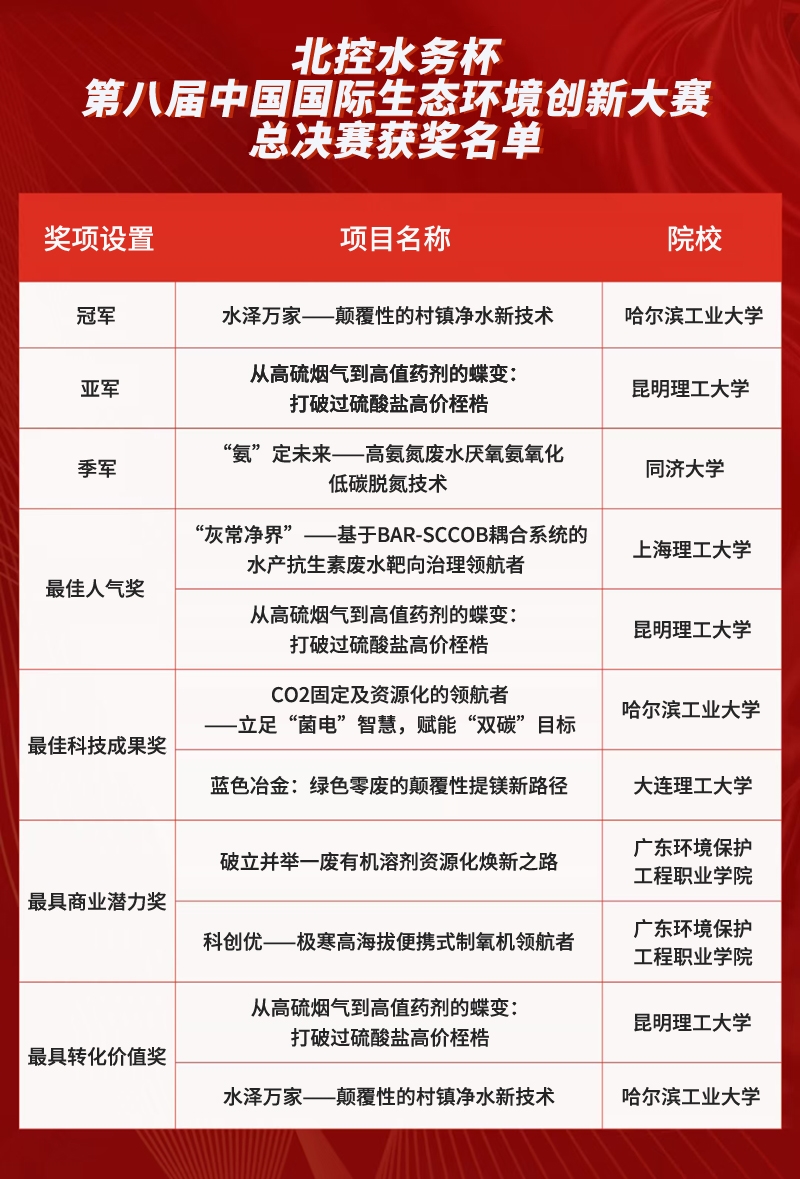 在评委们严谨、专业、公正的评选下,在参赛项目团队的精心准备与精彩展示下,来自哈尔滨工业大学的《水泽万家——颠覆性的村镇净水新技术》项目荣获冠军;昆明理工大学的《从高硫烟气到高值药剂的蝶变:打破过硫酸盐高价桎梏》项目荣获亚军;同济大学的《“氨”定未来——高氨氮废水厌氧氨氧化低碳脱氮技术》项目荣获季军。