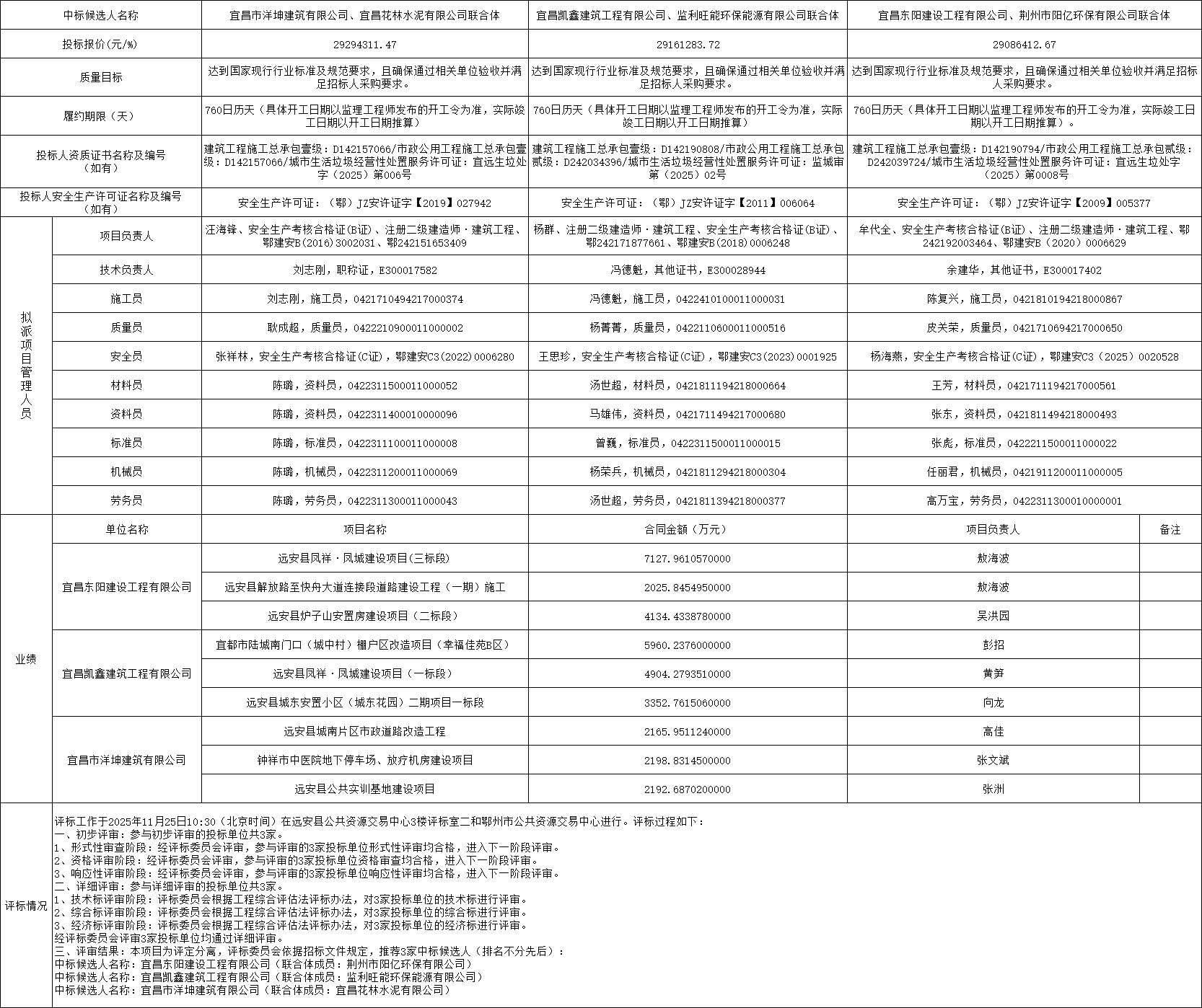 中标候选人名称:宜昌东阳建设工程有限公司(联合体成员:荆州市阳亿环保有限公司),投标报价:29294311.47元;