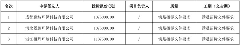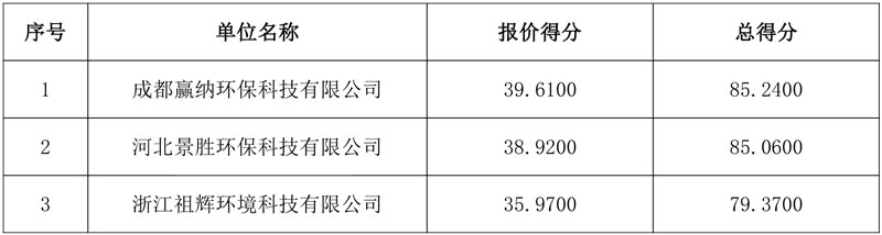 第一中标候选人:成都赢纳环保科技有限公司,投标报价:1075000元,单价:86元/吨;
