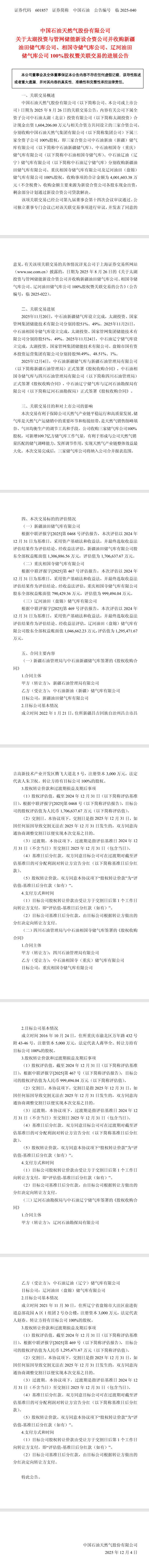 2025年12月4日,中石油新疆储气库与新疆石油管理局有限公司(新疆石油管理局)正式签署《股权收购合同》,中石油相国寺储气库与四川石油管理局有限公司(四川石油管理局)正式签署《股权收购合同》,中石油辽宁储气库与辽河石油勘探局有限公司(辽河石油勘探局)正式签署《股权收购合同》。