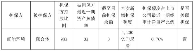 根据招标文件要求,旺能环境作为联合体牵头方,以联合体名义开具投标保函,投标保函总金额为1,200亿印尼盾(以2025年12月15日汇率折合人民币约5,064 万元,实际金额将以发生时汇率进行折算)。由旺能环境提供全额担保,担保类型包括投标保函、履约保函、预付款保函等。联合体成员AEP按其持有比例对旺能环境提供反担保。