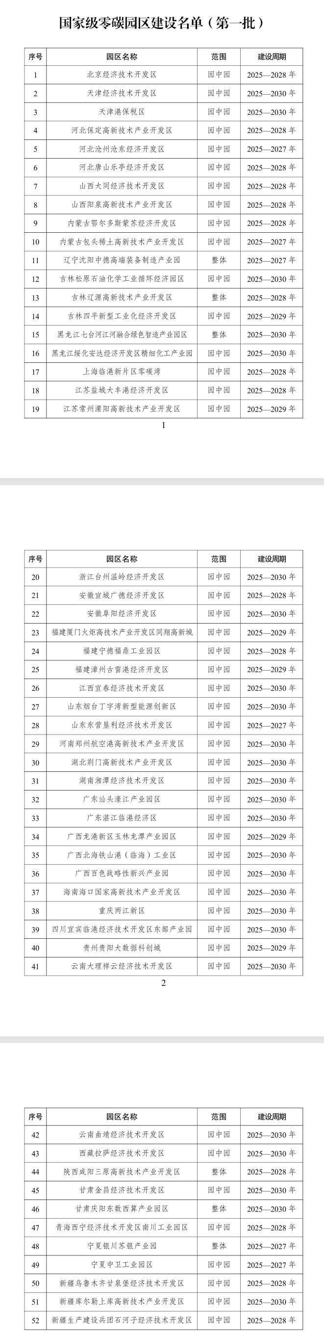 按照《国家发展改革委 工业和信息化部 国家能源局关于开展零碳园区建设的通知》(发改环资〔2025〕910号)要求,经园区申报、地方推荐、专家评审、部门会商等程序,确定了国家级零碳园区建设名单(第一批),共纳入52个园区。现予公布,并就有关事项通知如下: