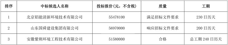 第三中标候选人:安徽紫朔环境工程技术有限公司,投标报价:51580000元。