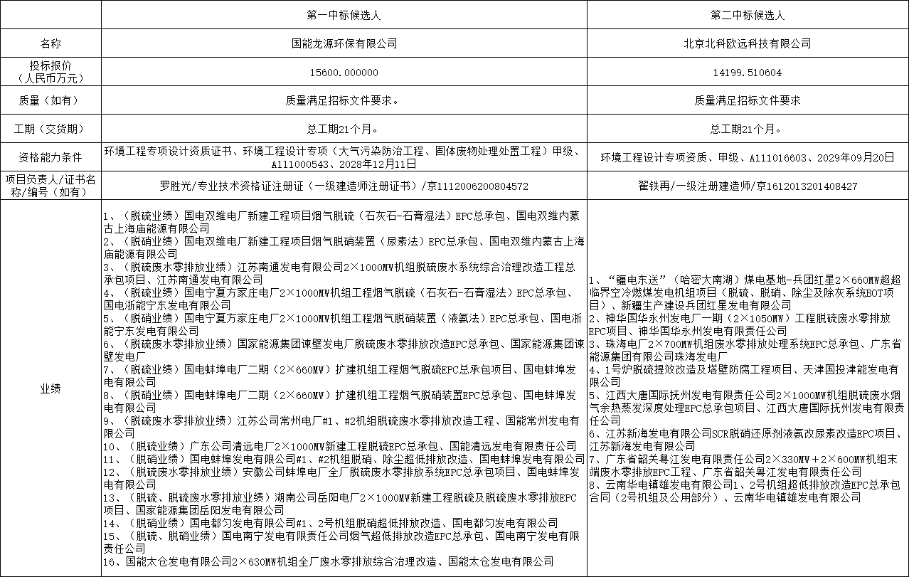 第一中标候选人:国能龙源环保有限公司,投标报价:15600万元;