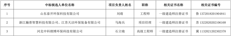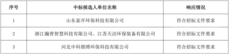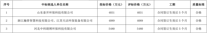 第一中标候选人:山东泰开环保科技有限公司,投标价格:4031万元;